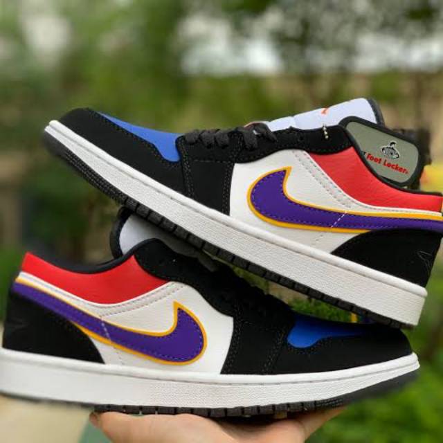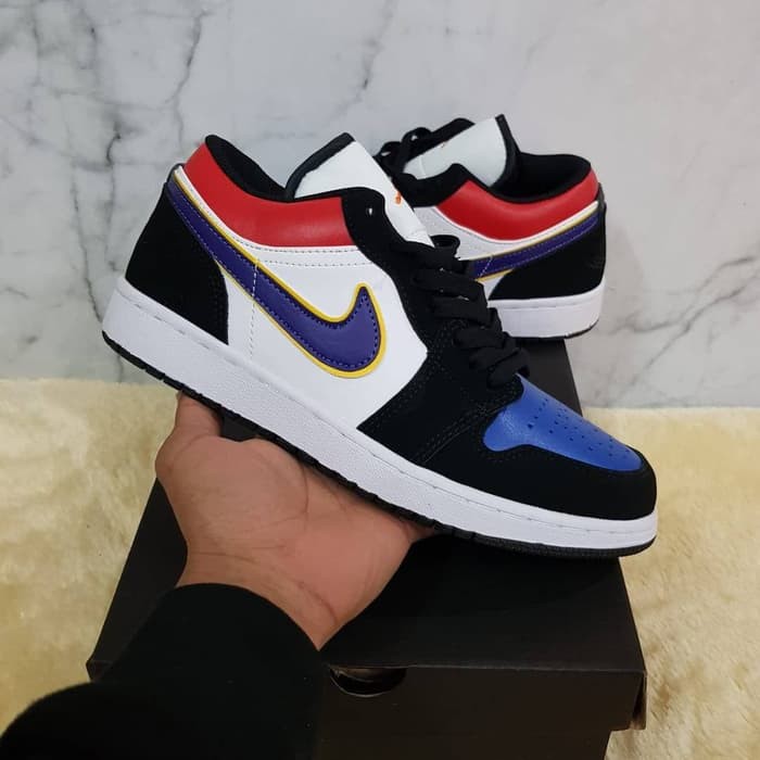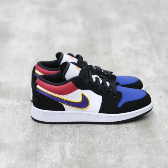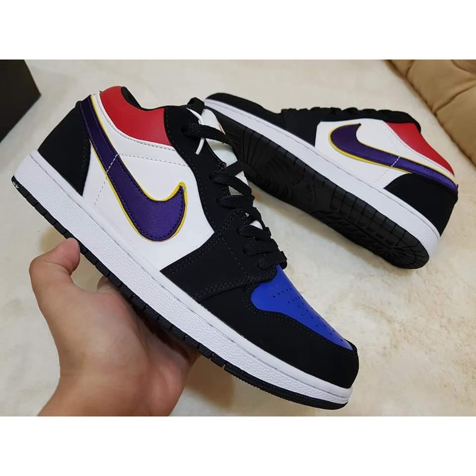 Constructed out of leather and nubuck the shoe starts off with white leather on the side panels game royal leather on the toe bright crimson leather on the collar black nubuck overlays and lakers themed swoosh logo on the side panels. Air jordan 1 low lakers top 3 cj9216 051 17. The air jordan 1 low lakers top 3 is a unique colorway for the low top jordan 1 that combines the top 3 look from the jordan 1 high with los angeles lakers team colors for the swooshes. Bao hanh tron doi san pham.