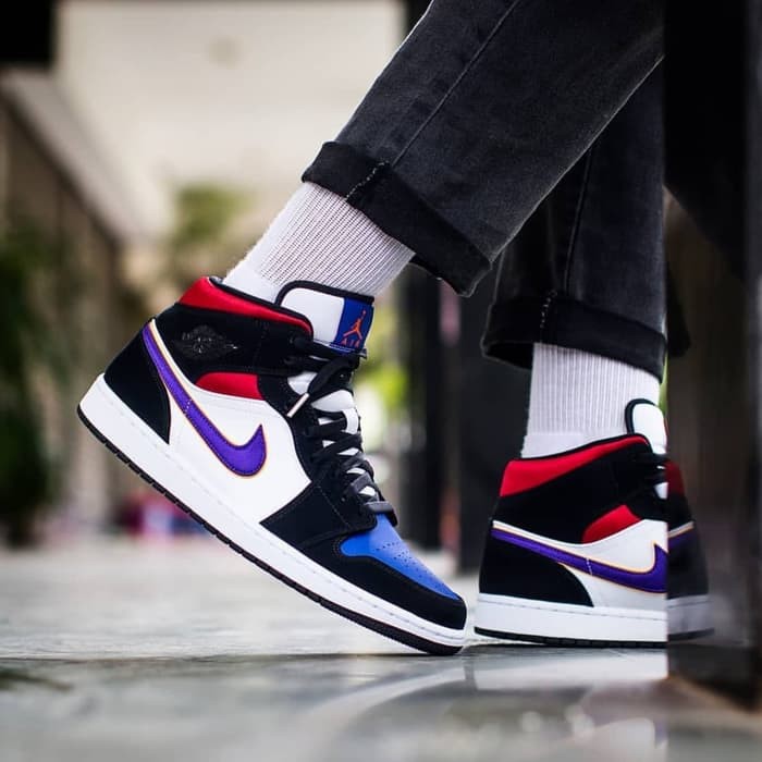 The leather and synthetic nubuck construction features a red white black and blue color scheme reminiscent of the top 3 colorway that combines the iconic bred chicago and royal jordan 1s. Air jordan 1 low lakers top 3 cj9216 051 write a review. This mid top air jordan 1 features the royal toe box with swoosh logos that nods to the la lakers. Condition is new with orange nike replacement box no lid.