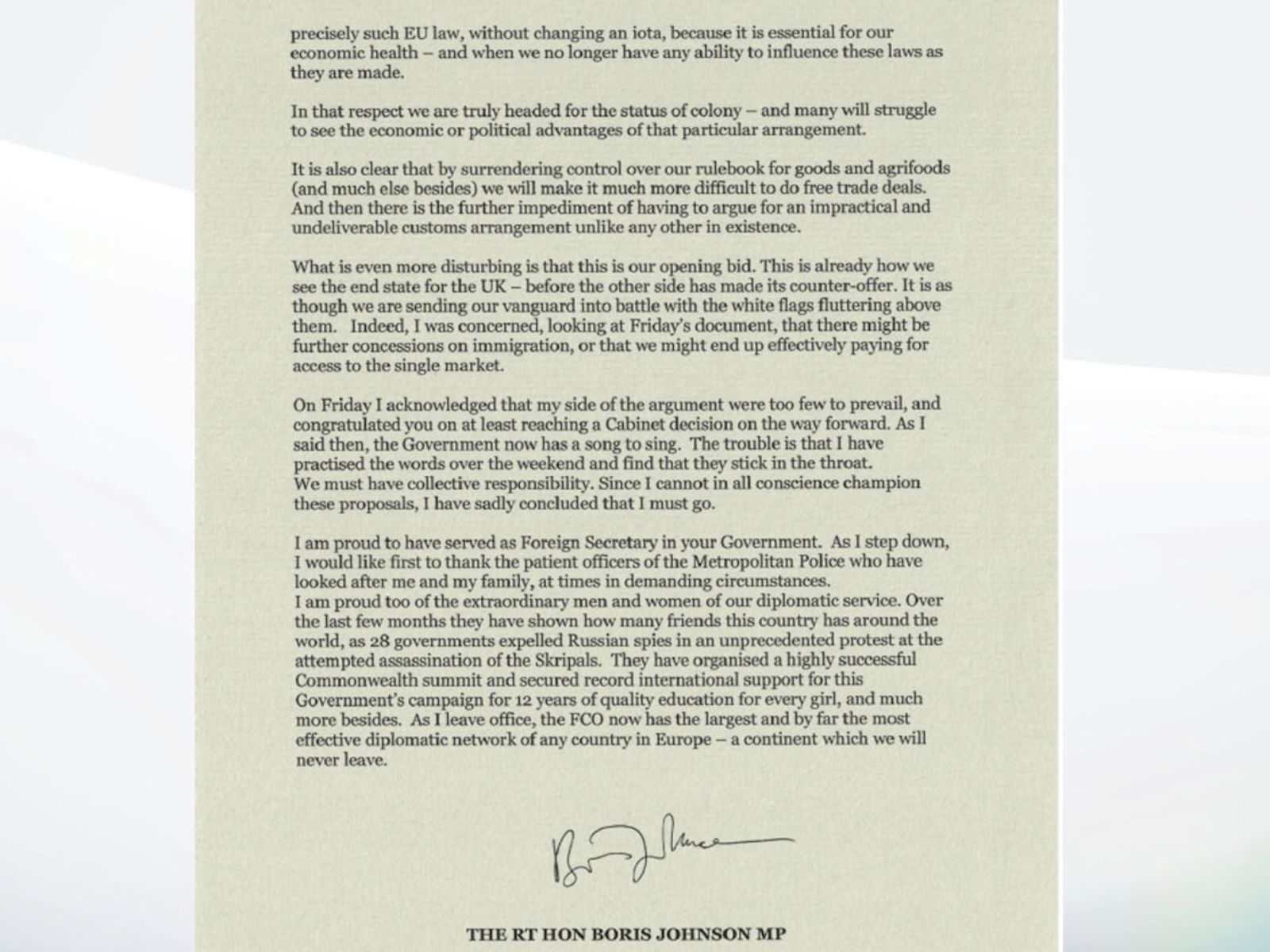 Boris Johnson Resignation Letter