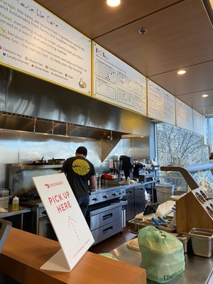 Breakfast 6 am 950 am lunch 11 am 2 pm dinner 430pm 730 pm grab and go food is always a choice. Hot food is not available 4 am 530 am. Soup and salad bar. A variety of snack items and desserts.