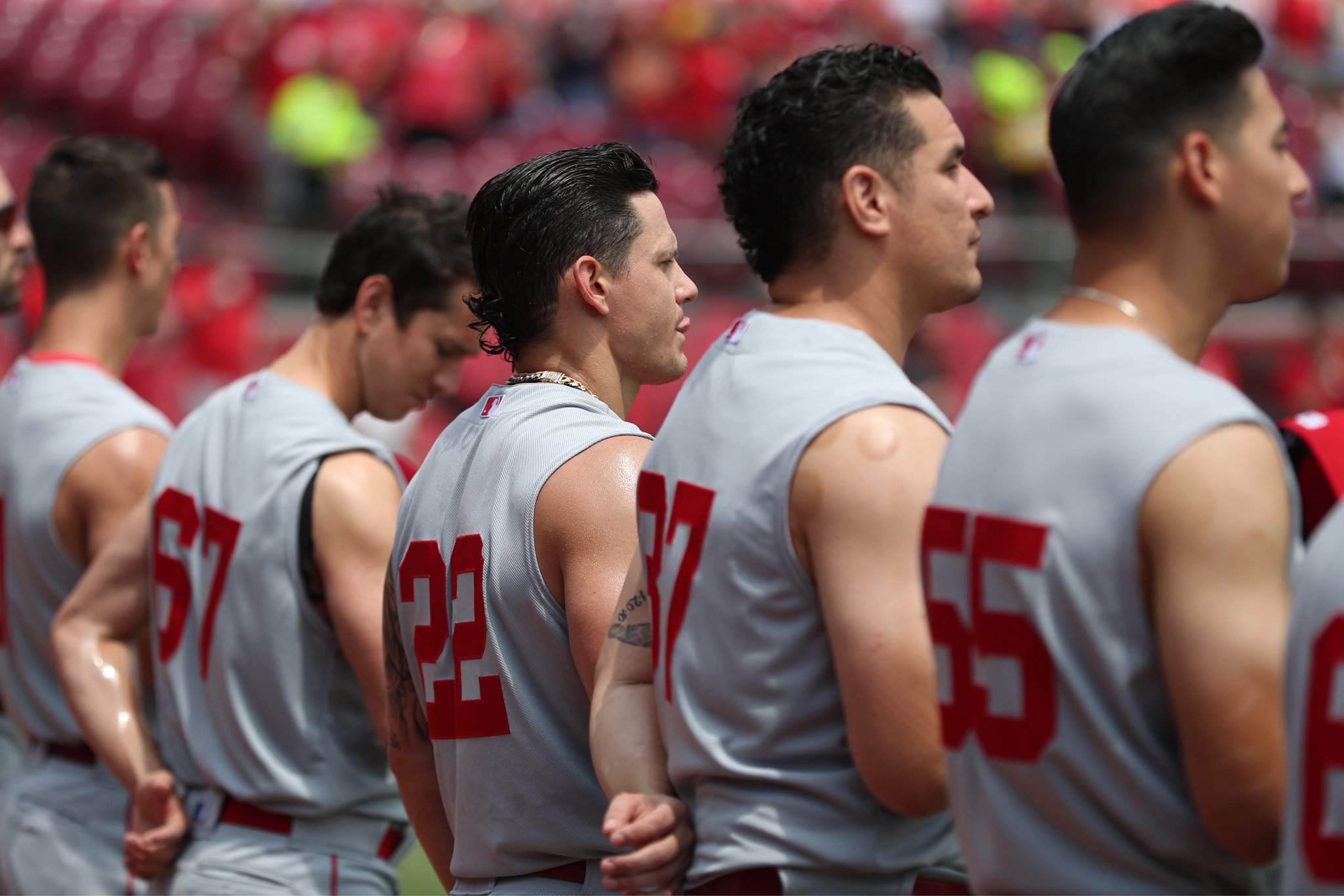 Cincinnati reds sleeveless jersey. The reds transitioned to todays modern look in 2007 but this particular rendition included an updated version of the original mustachioed mr. In recent years no team has gotten more creative with their jersey selection than the reds. To say this made their sluggers look even more imposing would be an understatement. On sunday the reds continued their season long trend of dusting off some seriously inspired uniforms from throughout their storied history when they took the field in sleeveless yes sleeveless jerseys for their game against the indians.