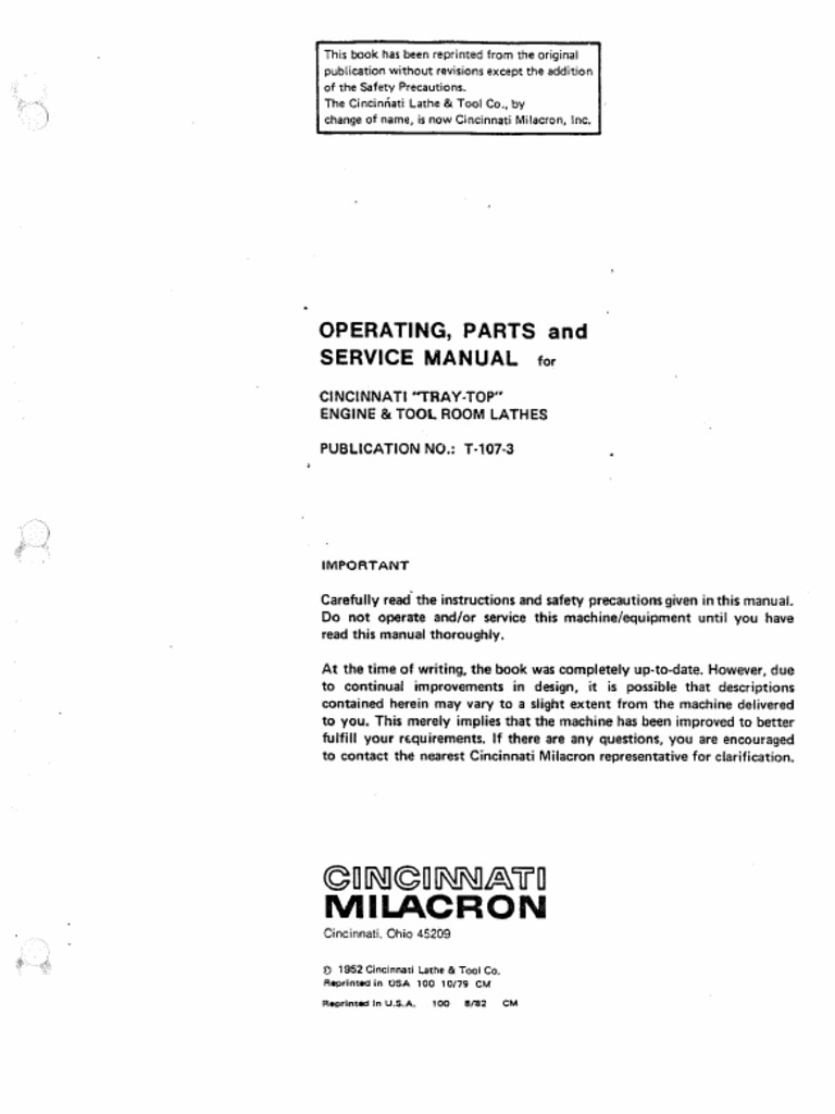 A perfect reproduction of the comprehensive installation operators instruction service maintenance and exploded diagram parts list manual. Operating parts and service manual for tray top lathe publication t 107 3 manufacturer. Cincinnati tray top lathe model 10 12 12 15 18 and tray top le lathes 15 inch and 18 inch. Cincinnati tray top lathe 12 12 x 18.