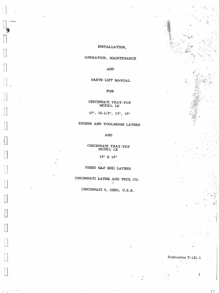 This manual contains information on lubrication maintenance and controls as well as a complete parts list and exploded views. Cincinnati tray top lathe model 10 12 12 15 18 and tray top le lathes 15 inch and 18 inch. It has 83 pages. Cincinnati lathe tool co.