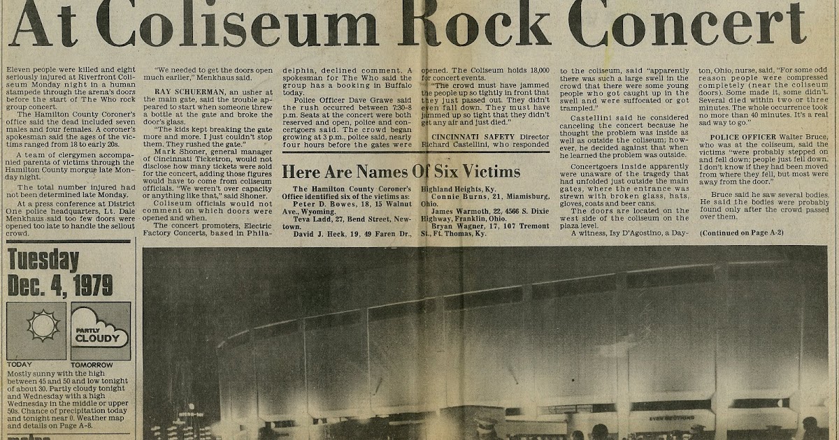 Connie sue burns aged 21 miamisburg. Tuesday marks the 40th anniversary of the who concert tragedy in. Eleven people were killed and eight seriously injured at riverfront coliseum monday night in a human stampede through the arenas doors before the start of the who rock group concert. The eleven people who died in the crush were.
