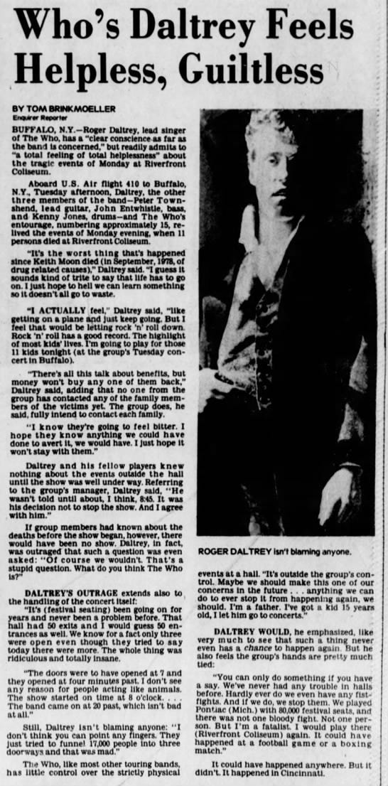 Survivors and victims families relive tragic night in cincinnati. Walter adams jr 22 trotwood ohio. Cincinnati eleven people were killed and eight seriously injured at riverfront coliseum monday night in a human stampede through the arenas doors before the start of the who rock group concert. Peter bowes aged 18 wyoming ohio.