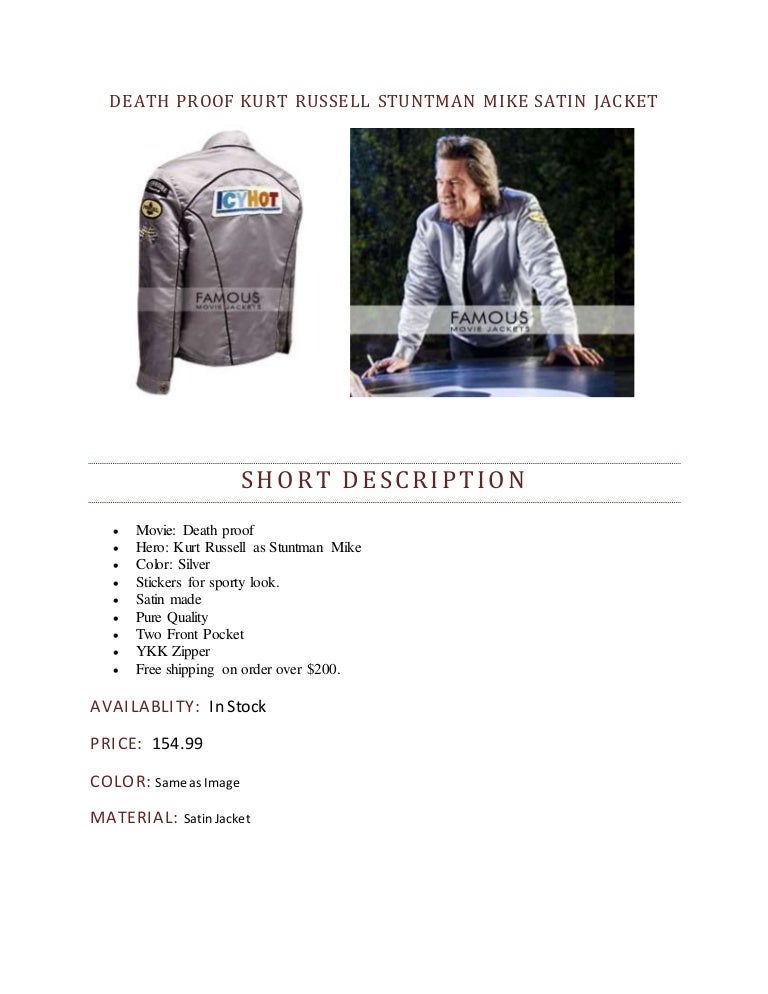 Death proof kurt russell jacket while performing most of his stunts in this film. Death proof kurt russell stuntman mike costume jacket with all patches ebay. This death proof kurt russell jacket will make sure that you look good and appealing. The most stylish and the stunning stuntman mike jacket.