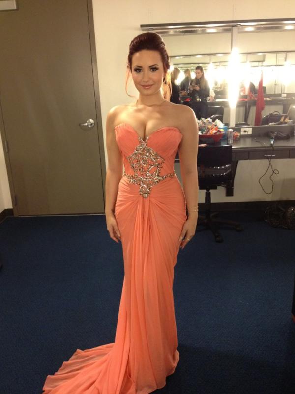 Demi lovato peoples choice awards 2012. Just like many others demi had a very difficult year that could have ended really badly for her so she cant help but think about how happy she is to simply be alive and be on a stage. She wore a strapless peach marchesa resort 2012 gown with a dramatic train and jewel encrusted bodice. The singer hosted the peoples choice awards. Before performing during the live broadcast demi lovato walked the red carpet at tonights 2012 peoples choice awards in la.