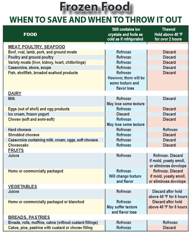 When the power comes back on check the temperature in the refrigerator or of. Put meats in the freezer. Discard refrigerated perishable food such as meat poultry fish eggs and leftovers after 4 hours without power. 24 hours in a half full freezer.