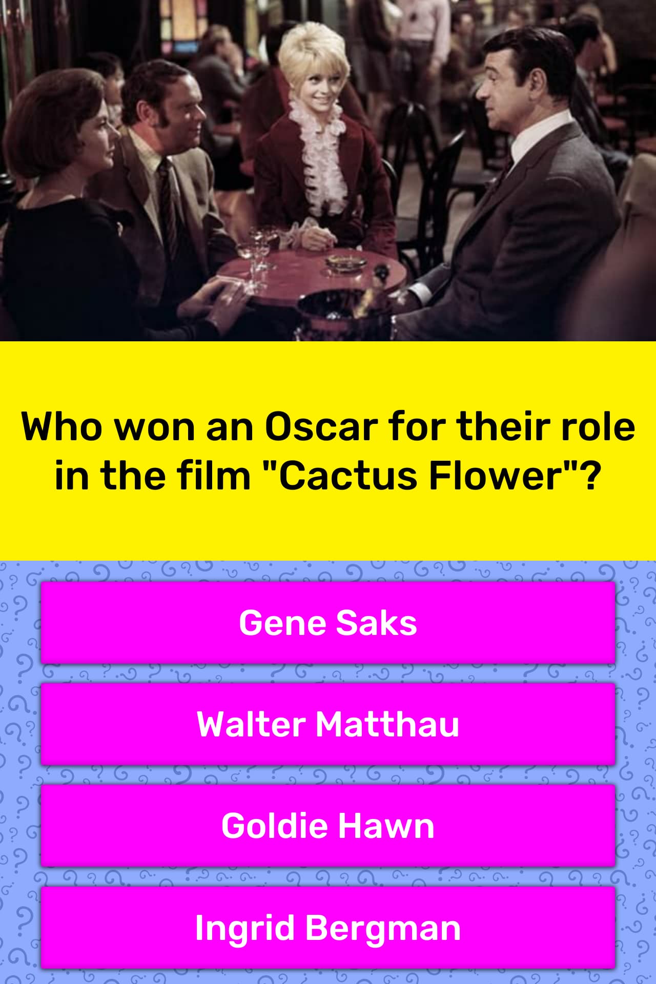 Goldie hawn cactus flower oscar. Cactus flower is a 1969 american comedy film directed by gene saks and starring walter matthau ingrid bergman and goldie hawn who won an oscar for her performance. Best actress in a supporting role. Hawn in her oscar winning debut plays toni a twentysomething free spirit engaged to dentist julian winston matthau who isnt ready to give up his bachelorhood just yet. Adapted from the broadway play cactus flower is nonthink entertainment given superlative star treatment by walter matthau ingrid bergman and goldie hawn.