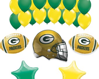Football green bay packers balloon product details. Foil helmet balloon 21in wide x 17in tall. Featuring a foil balloon shaped like a packers helmet this football balloon bouquet is accented with two gold football balloons displaying the packers logo and two gold and silver star balloons. Theres something for every packers fan in this mega collection and with a party kit not only do you get all the party basics for your event you save money over the cost of purchasing items individually.
