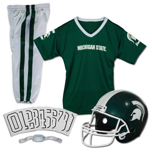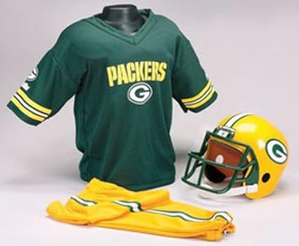 Jersey is one size fits most ages 5 9. Green bay packers authentic nfl deluxe team uniform set features a molded helmet upgraded mesh jersey material integrated shoulder pads and more. Featuring a full uniform with authentic nfl logos each set includes a helmet with chin strap jersey team pants an iron on number kit and a helmet number decal kit.