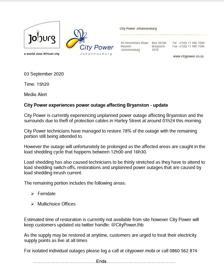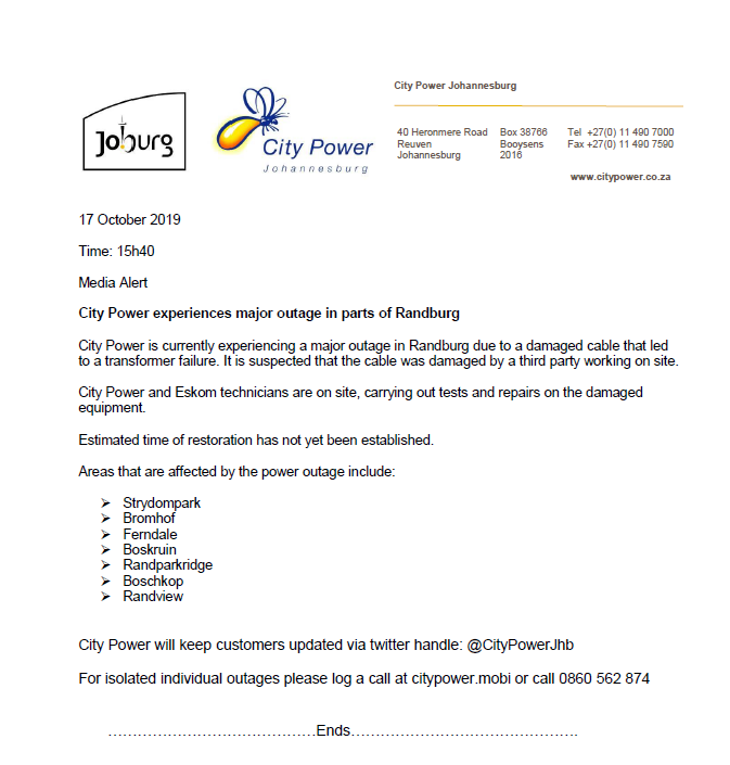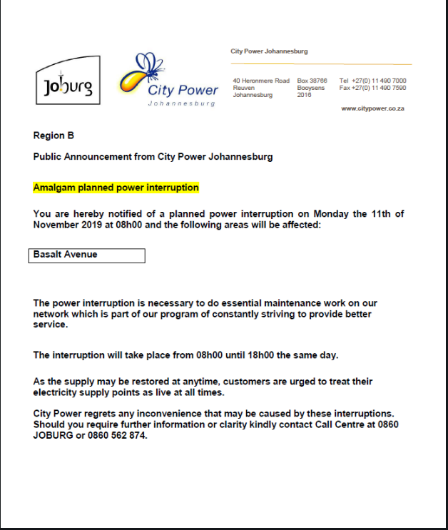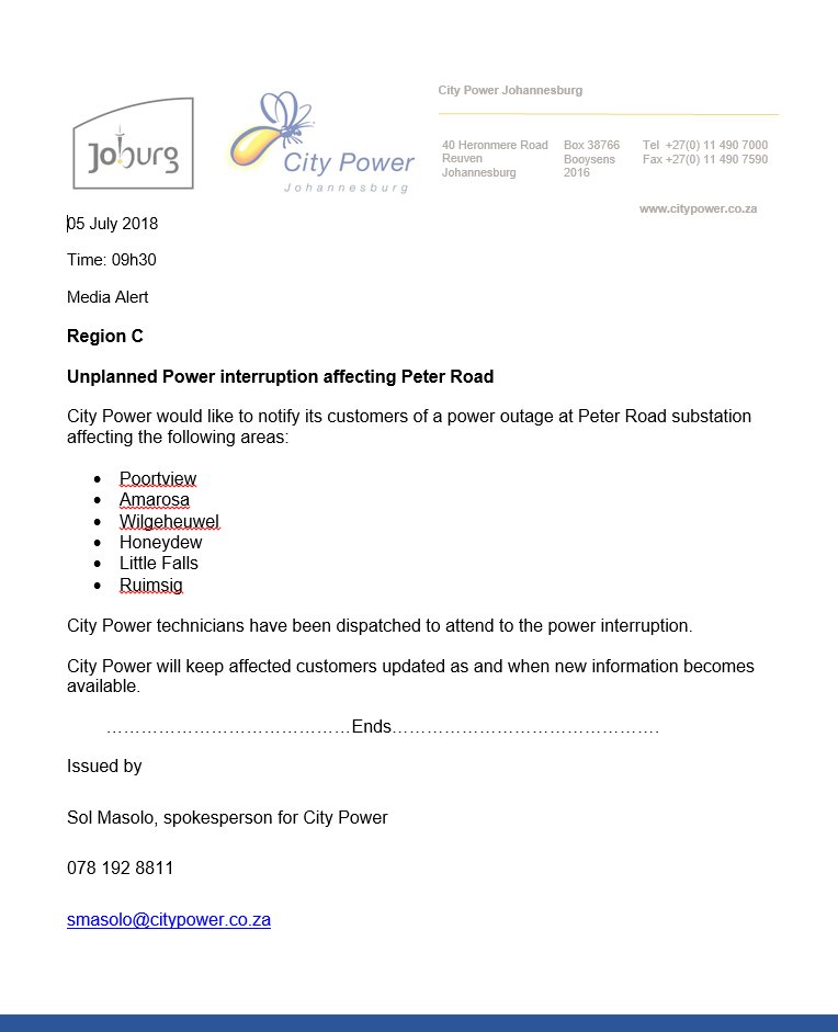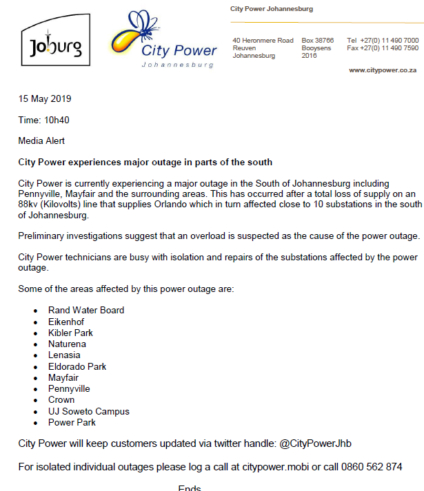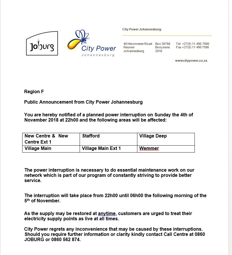 Reports in last 20 minutes. Atcitypowerjhb theres a power outage in yeoville is there any news on whats happened. The latest tweets from atcitypowerjhb. A planned outage is a power interruption that occurs when city power switches off electricity supply at a substation or other portion of the network in order to execute maintenance and or emergency duties to correct defects in the network so that it functions at its maximum potential.