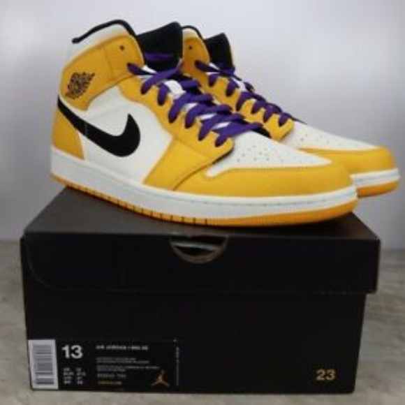 Additional details includes a black swoosh logo on the sides completed with purple laces and insoles for that la lakers vibe. Nike air jordan 1 mid lakers mens size 10 yellowwhite. These sneakers released in february 2019. This aj 1 mid sports a white upper with yellow accents black nike swoosh white midsole and a yellow sole.