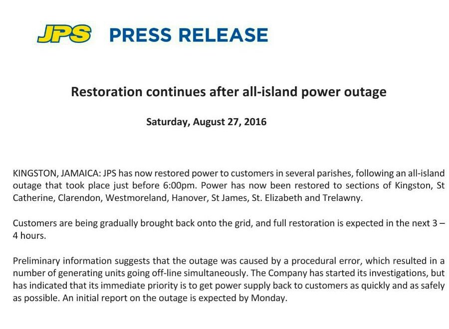Old harbour and surrounding environs have been listed for a scheduled power outage during the morning of october 20. Jps apologises for the inconvenience caused by these outages and will make every effort to restore power to the affected areas in the shortest possible time. Online jitters as power outage set for clarendon st catherine. Outage my jps contact us.
