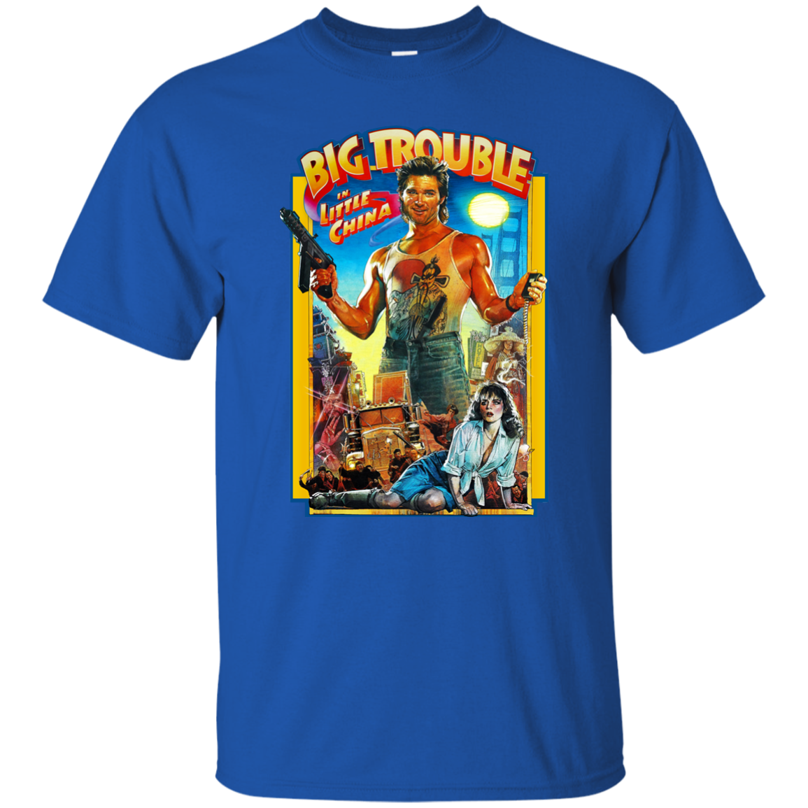 In the 1986 action film big trouble in little china jack burton kurt russell an all american truck driver is driven deep within san franciscos chinatown battling david lo pans james hong supernatural demons in order to rescue his friend wang chis fiancee. Big trouble in little china fu manchu kurt russell retro t shirt. Retro chinatown rbrow 80s big trouble. Description this big trouble in little china tank top is the same as worn by kurt russells character jack burton throughout the john carpenter movie.