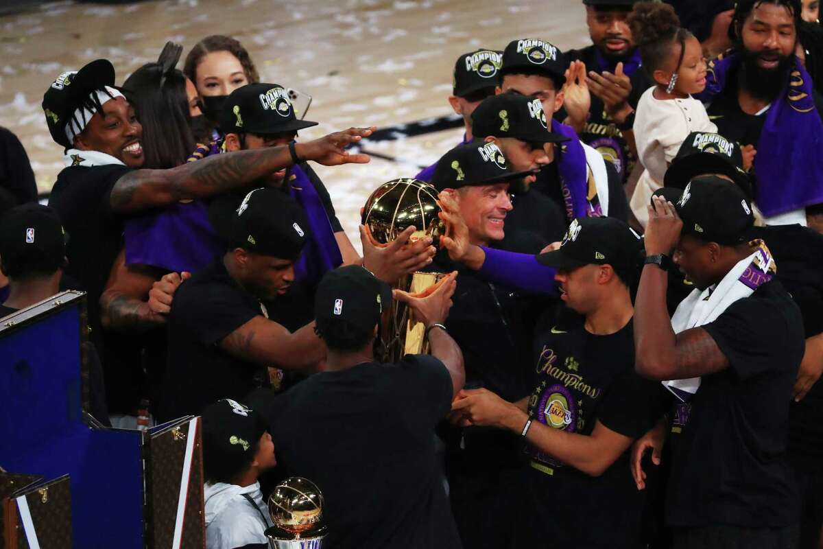 The lakers made history in game 6 winning the franchises 17th nba title tying the boston celtics for the nba record as the lakers went on to win 106 93 and become the 2020 nba champions. Los angeles lakers forward anthony davis 3 holds the finals trophy after game six of the 2020 nba finals at adventhealth arena. Lake buena vista florida october 11. The lakers celebrate with the larry obrien championship trophy after defeating the miami heat in game 6 of the nba finals on sunday night in lake buena vista fla.