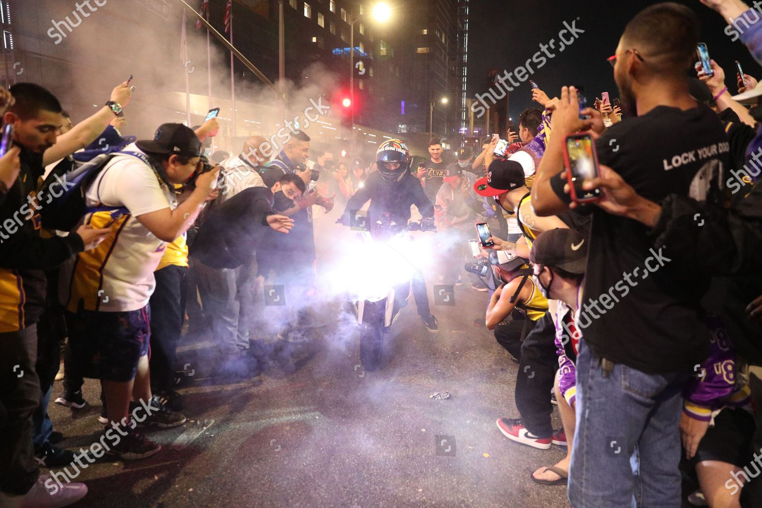 At least 76 people were arrested in downtown los angeles on sunday night following the lakers nba championship win marking the latest confrontation between lapd officers and a large street crowd. Police say that 2 people from the crowd were injured 8 police officers were injured and over 30 businesses as well as a metro bus were damaged and vandalized. Nba central atthenbacentral october 12 2020 around 76 people have been arrested for vandalism assaulting a police officer and failure to disperse. A los angeles lakers fan does a burn out as fellow fans gather near the staples center to celebrate the lakers title on oct.