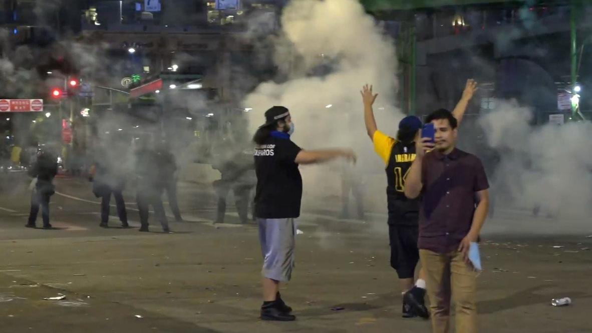 Los angeles lakers fans celebrate their team winning the 2020 nba championship against the miami heat amid the coronavirus pandemic 14 a man is detained by police outside the staples center after.