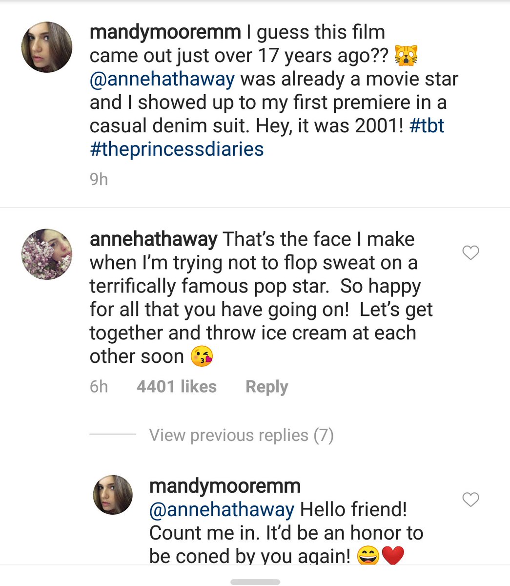Mandy moore shared a sweet throwback of herself and anne hathaway 17 years after the premiere of the princess diaries. Mandy moore and anne hathaway had the cutest princess diaries exchange on instagram on thursday august 23 17 years after the film premiered in 2001. Seventeen years ago long before reese witherspoon threw an ice cream at meryl streep for big little lies anne hathaway smacked an ice cream all over mandy moores chest in the princess diaries. Since appearing in the disney movie anne has earned rave reviews for her performances in les miserables and the dark knight rises.
