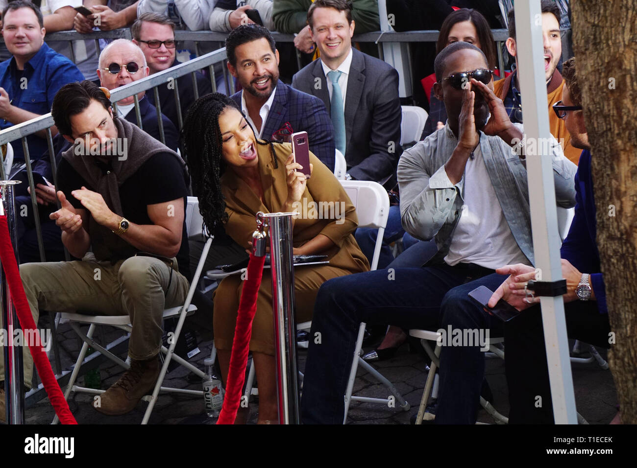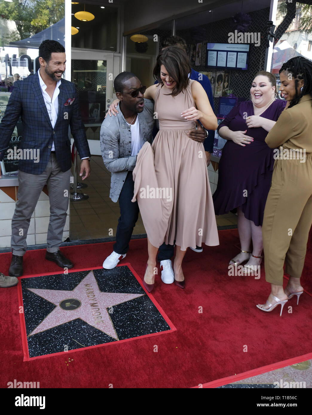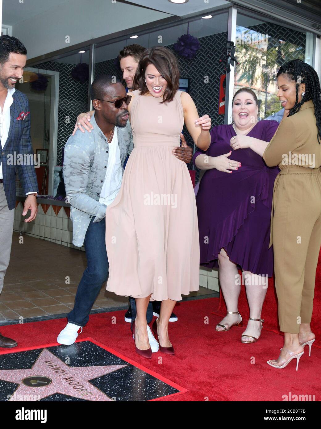 Actor Sterling K Brown Picks Up Actress And Musician Mandy Moore As Actors Milo Ventimiglia Jon Huertas Justin Hartley Susan Chrissy Metz And Susan Kelechi Watson L R Look On During An Unveiling