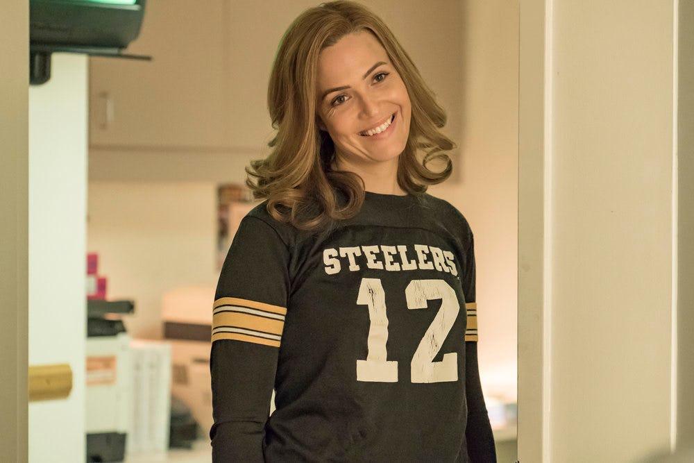 The pearsons got the perfect gift from their favorite football team. In this episode she gets to sing at her favorite bar on super bowl sunday and her favorite team the pittsburgh steelers are in it. At the bar rebeccamandy moore sings with the irl band dawes. Tap to play or pause gif.