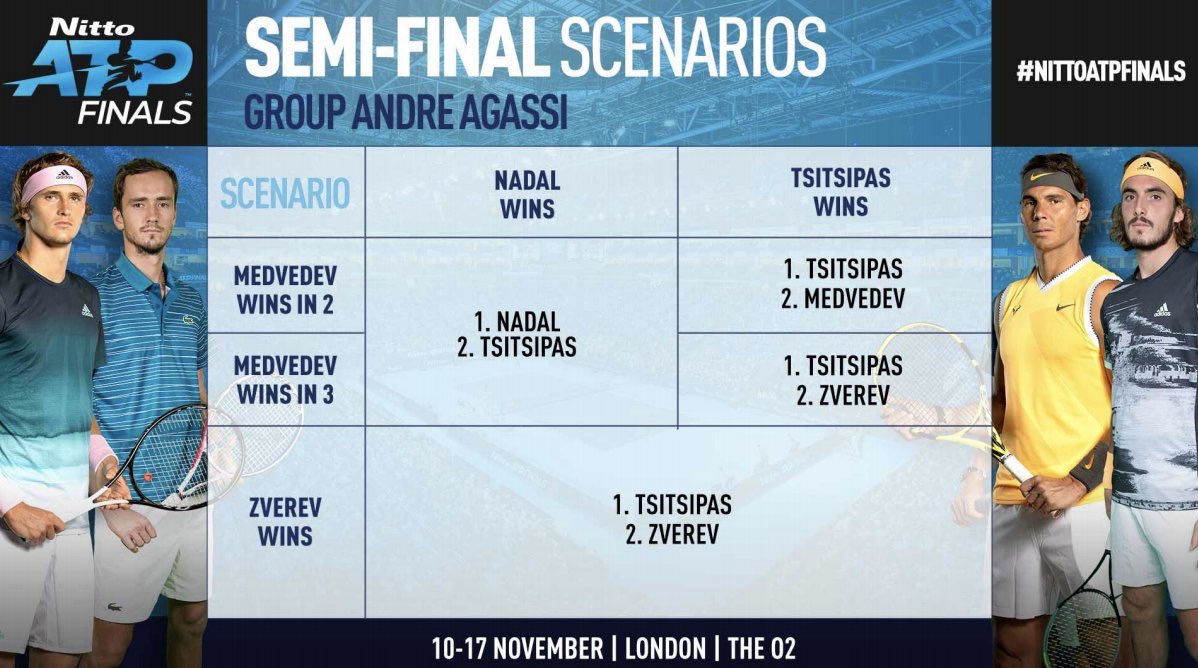 Qualification scenarios for the nitto atp world tour finals rafael nadal. Nitto atp finals 2018 qualification scenarios. The 2019 atp finals also known as the 2019 nitto atp finals for sponsorship reasons was a mens tennis tournament played at the o 2 arena in london united kingdom from 10 to 17 november 2019. If tsitsipas and medvedev win in two sets both of them will qualify for the semifinals at atp world tour finals 2019.