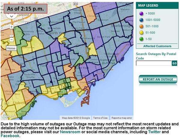 On the toronto hydro outage map the utility reported a large area without power involving around 5000 houses affected in the east york area as of 8 pm. Report a power outage. Get updates every ten minutes and track local weather with the storm centre online map and hydro one mobile app.
