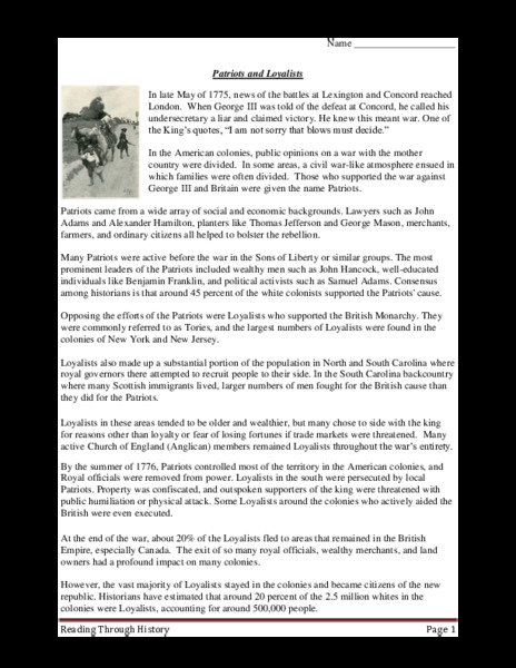 Patriots loyalists and neutralists worksheet. There was a high concentration of loyalists in new york city and in the southern colonies. American revolution unit loyalists patriots neutralists 2. For each biography they must explain why they made their decision. They may have been wealthy or simply believed that great britain was justified in its actions.