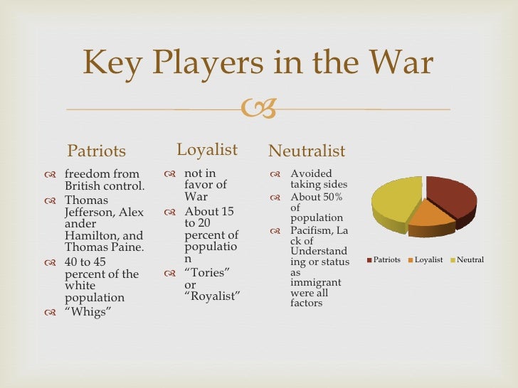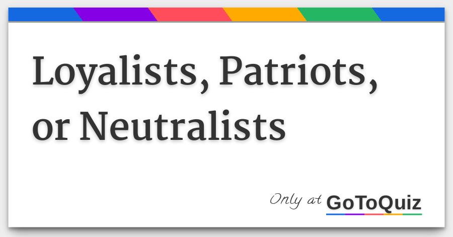 Sided with britain hoped that the colonists would come to peaceful terms with the british government were mostly wealthy white land owners. Loyalists patriots and neutralists loyalist the colonists who opposed independence from britain were known as loyalists or tories. Neutrals or neutralists didnt partake in the battles that their patriot and loyalist brethren often fought. Loyalists fence sitters and patriots.
