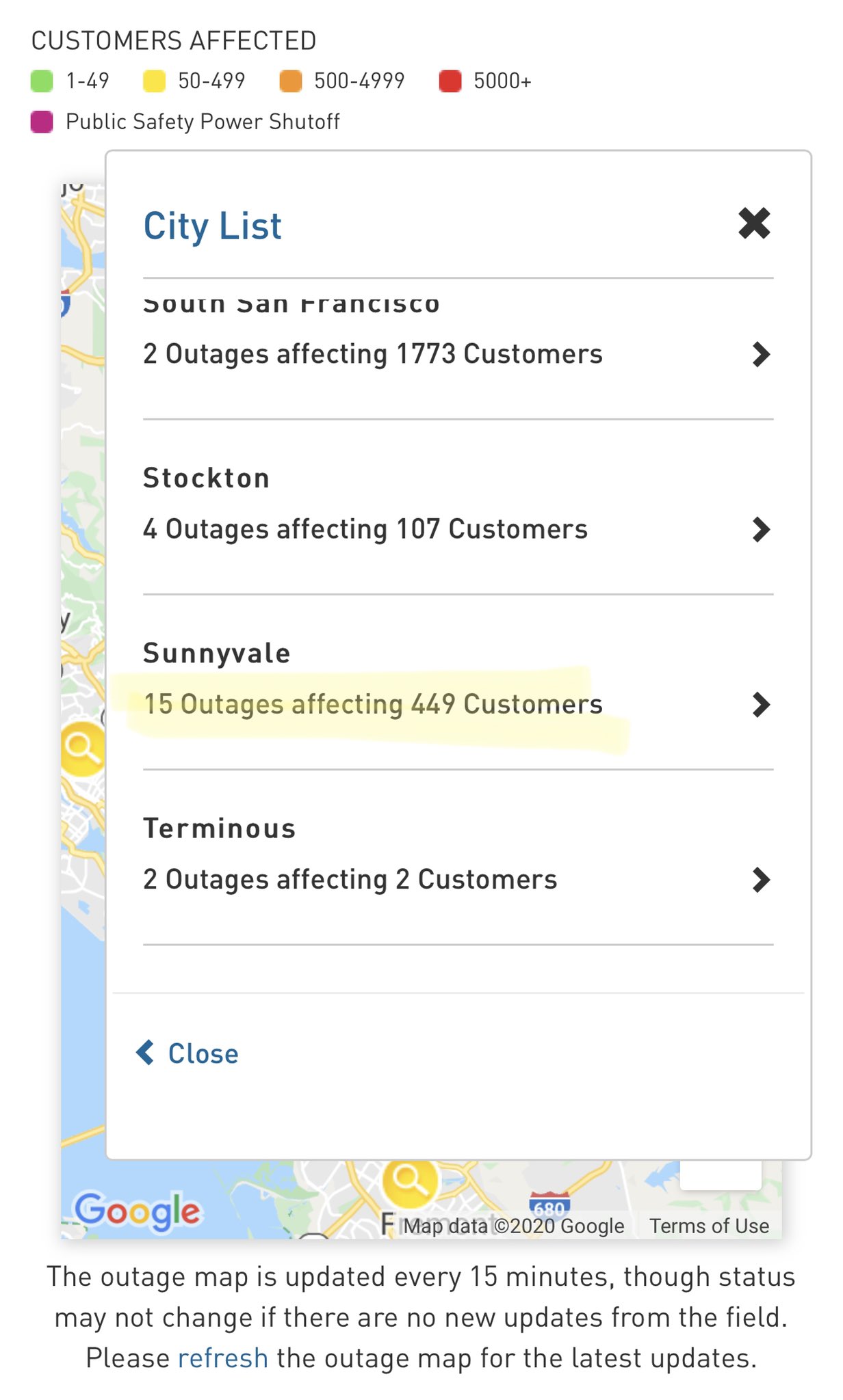 Pacific gas electrics outage map is updated every 15 minutes with information about electrical outages in northern california. 94708 i assume is experiencing a atpge4me pgampe power outage. Is pacific gas and electric company having an outage in sunnyvale santa clara county california right now.