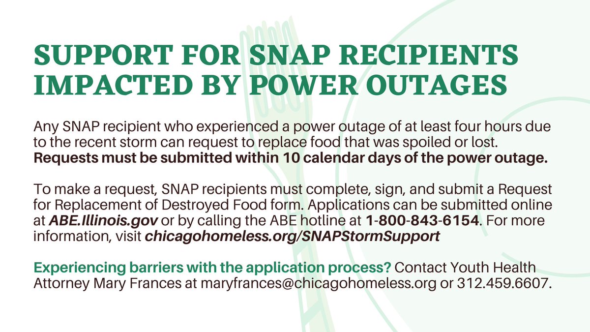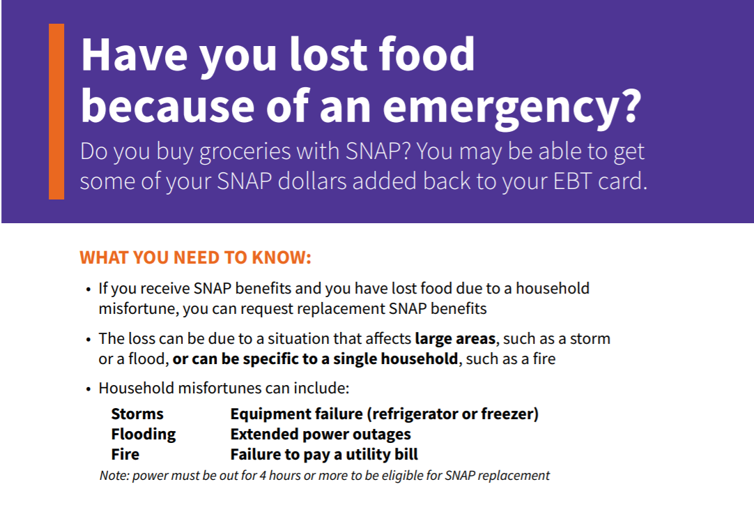 If you are a snap recipient and your household has experienced a misfortune such as a fire or flood or a power outage lasting more than four hours that results in a loss of food you may be eligible for snap replacement benefits. Discard refrigerated perishable food such as meat poultry fish eggs and leftovers after 4 hours without power. Families who receive snap benefits can apply for reimbursement funds if they lost food or groceries due to the storm. Subscribing to im alerts gives you instant notification for.