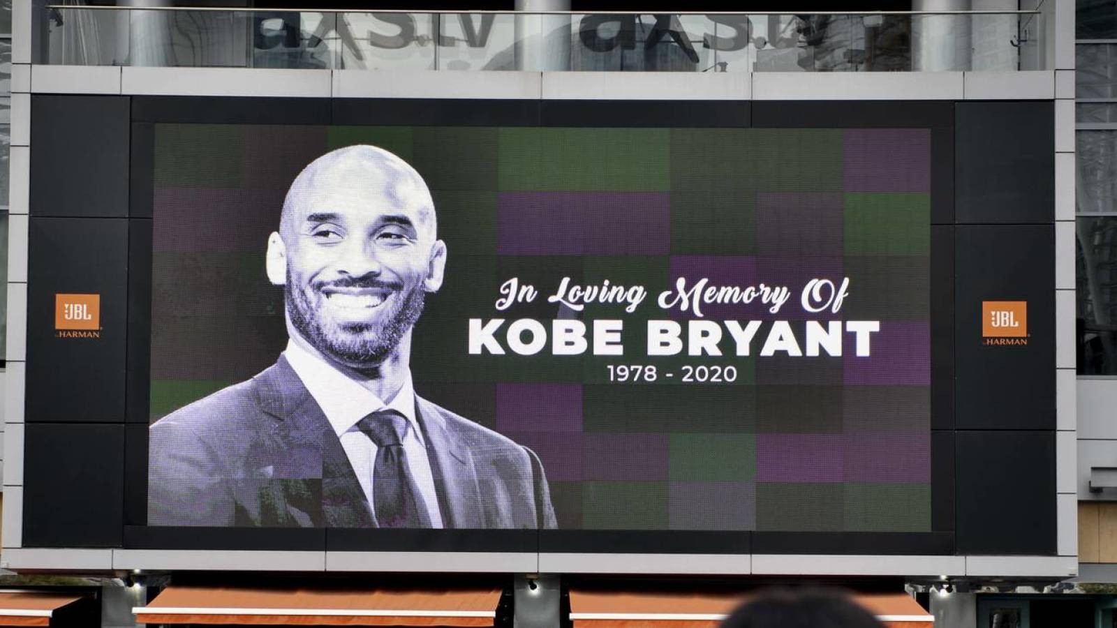 Kobe bryants retired lakers jerseys are on display and lit up inside the staples center.